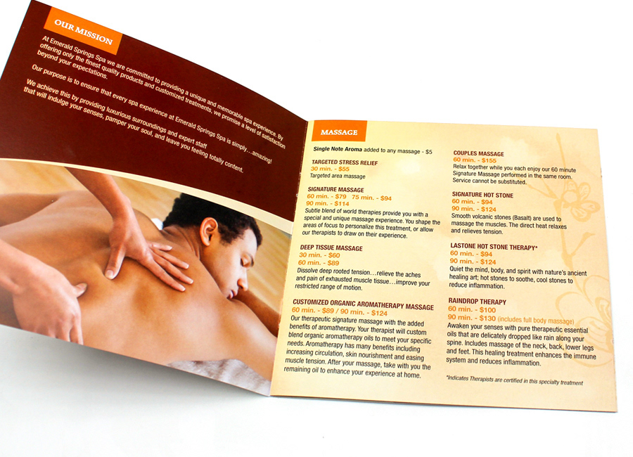 Multi-page brochure for Emerald Spring Spa showcasing their spa services.